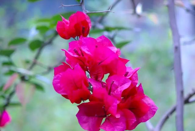 三角梅又称叶子花,花色绚丽开得泼泼辣辣,深受人们的喜爱。花很细小,黄绿色,三朵聚生于三片红苞中,外围的红苞片大而美丽,有鲜红色、橙黄色、紫红色、乳白色等。花期可从11月起至第二年6月。