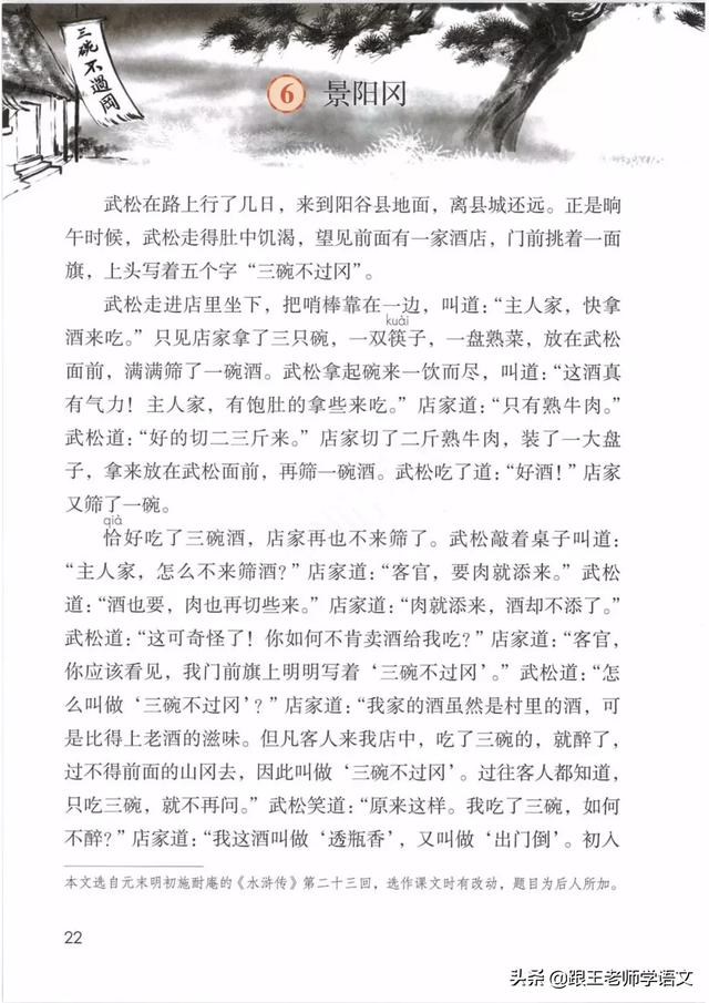 《景阳冈》是根据我国著名古典小说《水浒传》第二十三回选编的。课文记叙了武松在阳谷县的一家酒店内开怀畅饮后,趁着酒兴上了景阳冈,赤手空拳打死猛虎的故事,表现了武松豪放、勇武而又机敏的英雄性格。
