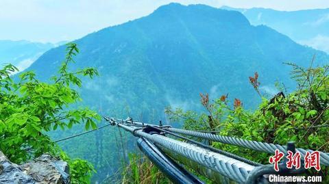 “龙池飞线”由两根钢丝绳和一根水管组成,两头“系”在大布滩河两岸的悬崖上。 周星亮 摄