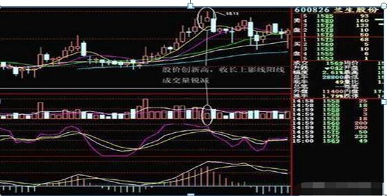 1、 股价创出新高收带上影线阳K线,但成交量锐减。 股价创新高,说明已经经过一轮波段涨幅,这轮涨幅从突破10日均线算起至少有20%涨幅以上,在这种情况下,股价当天创出新高后,盘中受到卖压而出现回落,因此,当天的K线以带上影线的阳K线报收。但成交量相对前一交易日出现的明显减少萎缩,这说明主力已经在盘中出货,股价即将见顶回落。此时应及时果断卖出。