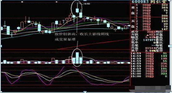 2、股价创新高收带长上影线阴K线,但成交量暴增。股价创新高说明已经经过一轮高达20%以上的单边波段涨幅,在这种情况下,股价于当天创出新高后,盘中出现卖压而回落,当天的K线以带长上影线的阴线报收。但成交量相对前一交易日却出现大量剧增,这说明主力已经在盘中疯狂抛货,股价即将见顶回落。此时,应当及时果断卖出。