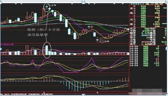 3、 股价创新高收小十字星K线,但成交量暴增。股价当天创出新高后,盘中受到卖压而出现回落。由于跟风买进的投资者相对积极,盘中产生窄幅震荡整理,因此,当天的K线以带长上下影线的十字星报收。但成交量相对前一个交易日却出现明显放大迹象,这说明主力已经在盘中反复震荡出货,股价即将见顶回落了。此时,应当及时果断卖出。