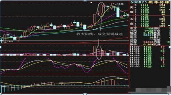 4、 股价创新高收大阳K线,但成交量锐减。股价于当天反复震荡盘升创出新高,并收盘于最高价附近,当天的K线以大阳线报收。但成交量相对前一个交易日明显萎缩,说明当天的上涨主要由主力在盘中对敲完成,而实际情况却是在盘中悄悄出货,股价攻克乏力,即将见顶回落。此时,应于次日及时果断卖出。