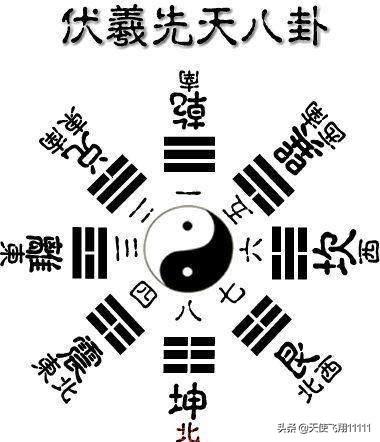 古人将先天卦位演化到后天卦位,是个复杂而有趣的过程,因为五行学术的加入,先天卦需以五行归纳之。相传先天八卦为伏羲所画。先天八卦来自于河图,它是乾坤定南北,坎离定东西,是天南地北为序,上为天为乾,下为地为坤,左为东为离,右为西为坎。故先天八卦数是:乾一、兑二、离三、震四、巽五、坎六、艮七、坤八。它的中间数为0,以代表五或十。0象征着宇宙的元气。它的序数对宫相加之和为九数。乾,天也,故称乎父,坤,地也,故称乎母。