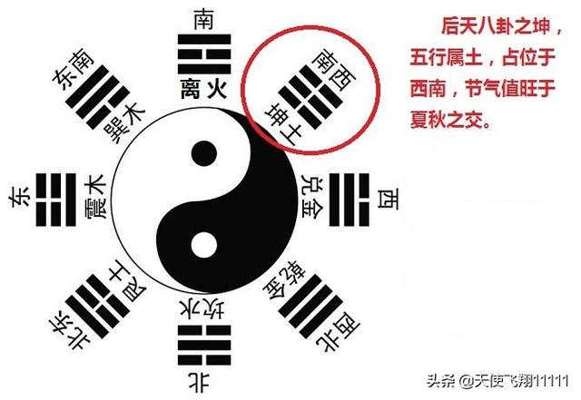 后天八卦为文王所画。后天八卦来自于洛书。后天八卦是坎离定南北,震兑定东西。故后天八卦数是:坎一、坤二、震三、巽四、中五、乾六、兑七、艮八、离九。它的中间数为五,与对宫纵横相加之和为十五数。后天坤卦总论为土,位于西南方位,气候值旺于夏秋之交。