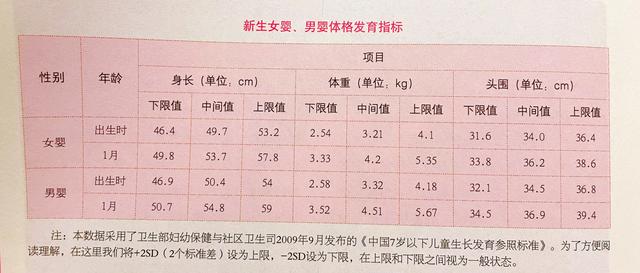 根据2009年9月卫生部妇幼保健与社区卫生司发布的《中国7岁以下儿童生长发育参考标准》,新生女婴/男婴体格发育指标如下图。