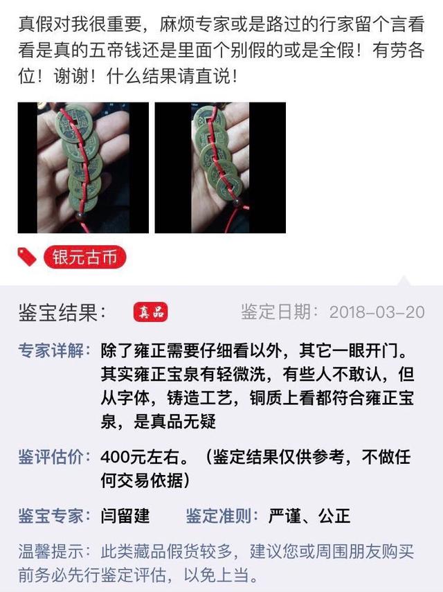 所以说五帝钱就算是不能带来好运也不至于招来霉运吧!可是这位吧友的亲身经历就是这样,有朋友留言猜测可能是今年第二次水逆快要来了,所以吧主才会这么倒霉。可也有人说水逆毕竟还没到呢,所以可能还是五帝钱惹得祸!而在今天这位吧友终于给大家解答了疑惑,原来他的那串五帝钱里有一枚是假的,可能这是霉运的主要原因。那么真五帝钱究竟长啥样呢?今天小编给大家带来一款经过专家鉴定的真五帝钱。