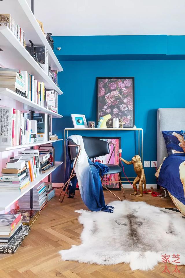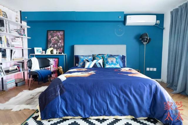 # 楼上则是以蓝色为主色,大面积的深蓝色让卧室的基调暗下来,营造出令人舒缓放松的休息氛围。