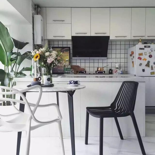 # 将封闭式厨房改成开放式之后,这里成了最能代表家的地方。选择了白色作为主色调,干净清爽,视觉上减轻了厨房重地的杂乱感。