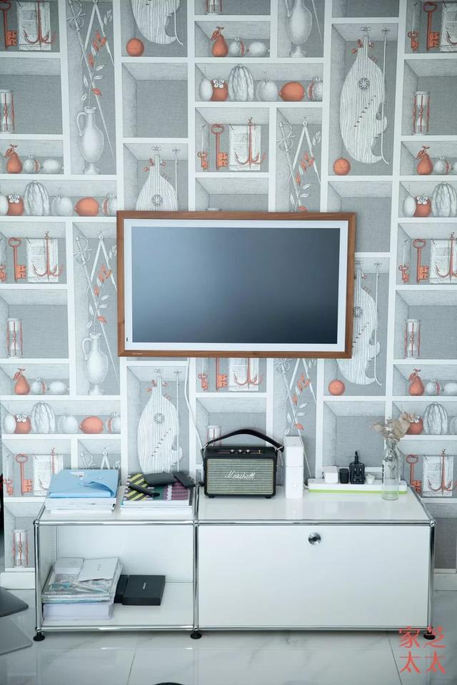 # 黑白壁纸与客厅整体色调协调,Cole&Son博古架图案的壁纸增加了墙面立体感,壁纸上的红色也与别处的红色一起串联成了空间的点缀色。