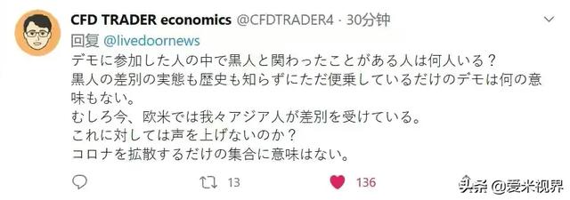 “参加游行的人中有多少人与黑人有过牵连?黑人歧视的实际情况和历史都不知道只是搭便车而已的示威没有任何意义。相反,我们亚洲人现在在西方受到歧视。你们不对此发出声音吗?仅仅扩散新冠肺炎的集合没有意义。”