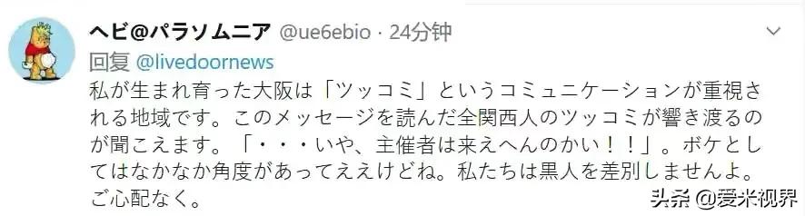 我出生成长的大阪是一个重视“吐槽”交流的地区。可以听到全关西人读了这个消息后的吐槽。“……不,主办方不能来现场吗就在家里呆着看戏啊? !”。这是装傻角度哦。我们不歧视黑人哦。请不要担心。