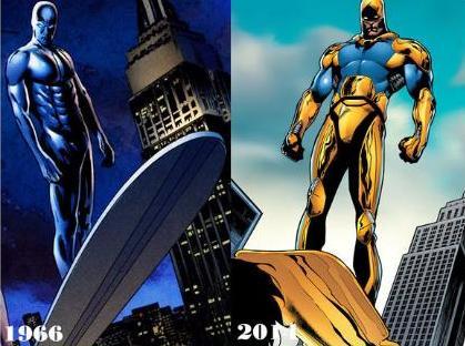 共同点: 能力其实没太大共同点,唯一的共同点都是站在滑板上飞行,不过这造型··也太像了吧!对比全身银色这位几乎全身金色同样是踩在滑板上。PS:DC守护者一共四代,第一代1942年就登场了,只不过造型师拿个像熨斗一样的盾牌,也没有飞行的能力,而且后两代几乎和初代一模一样,唯独到了这一代就完全变味道了。