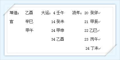 该女命不知生时,月干官星明透,年支酉金为官之禄,巳酉合金助官,官星早透主早婚,时间当在20岁左右,且“官星明朗夫峥嵘”,丈夫必才能出众。确定了婚姻早晚及大体的年龄段后,再看具体结婚年份。14岁后行癸未大运,18岁后走“未”字,与八字中巳午正好会成巳午未火局,夫宫被合,18至22岁间必婚。其间的流年为癸卯、甲辰、乙巳、丙午、丁未。该八字官星和伤官均旺,当以比劫为喜用。1963年癸卯,1964年甲辰,1965年乙巳,这三年都有成婚的可能性。再细推敲,癸卯年虽癸水生木,但卯酉逢冲,冲太岁,会有谈恋爱的动因,不会结婚。1965年乙巳,虽乙木为喜用,可以结婚,但巳为食伤泄气,巳酉合官克身,也不会成婚。唯有1964年甲辰,甲木明朗,辰为湿土,可以晦火,应断该年结婚。该女于1964年甲辰结婚,后生一子一女。
