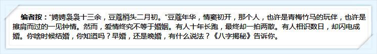 确定婚姻的早晚,先观其大象,有个大体的概数,之后再根据岁运确定具体的婚期。