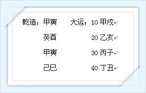 该男甲木雄壮,月干正印又生木,正财为妻星在时干。财星晚现主晚婚。比劫多而强旺,财星衰弱亦主晚婚。成婚时间当在30岁左右。观其行运,20岁始行乙亥,正是适婚的年龄,但乙亥为木水,均为忌神,结婚的可能性不大。到30岁始行丙子大运,丙为食神,可泄身生财,当论婚姻。再从流年看,30岁甲申,甲木来合命中己土财星,申金冲动妻宫,天合地冲,当是婚姻之期限。