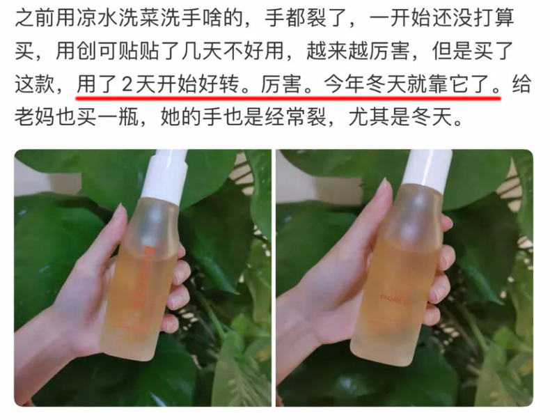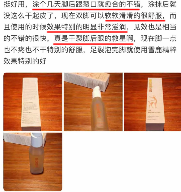 “每年秋冬脚后跟都会干裂。多亏了Bioreve精粹,才涂了一周左右,干纹裂痕完全消失了!”