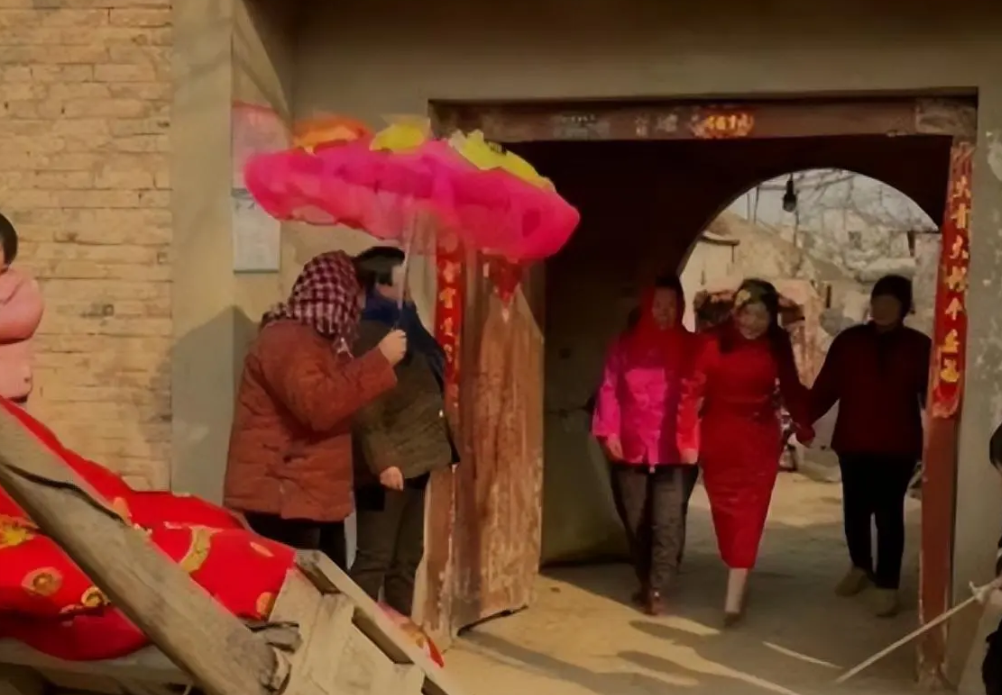 孙巧云穿着红色的缎子袄,头上盖着红盖头,在几个姐妹的搀扶下下了花轿。