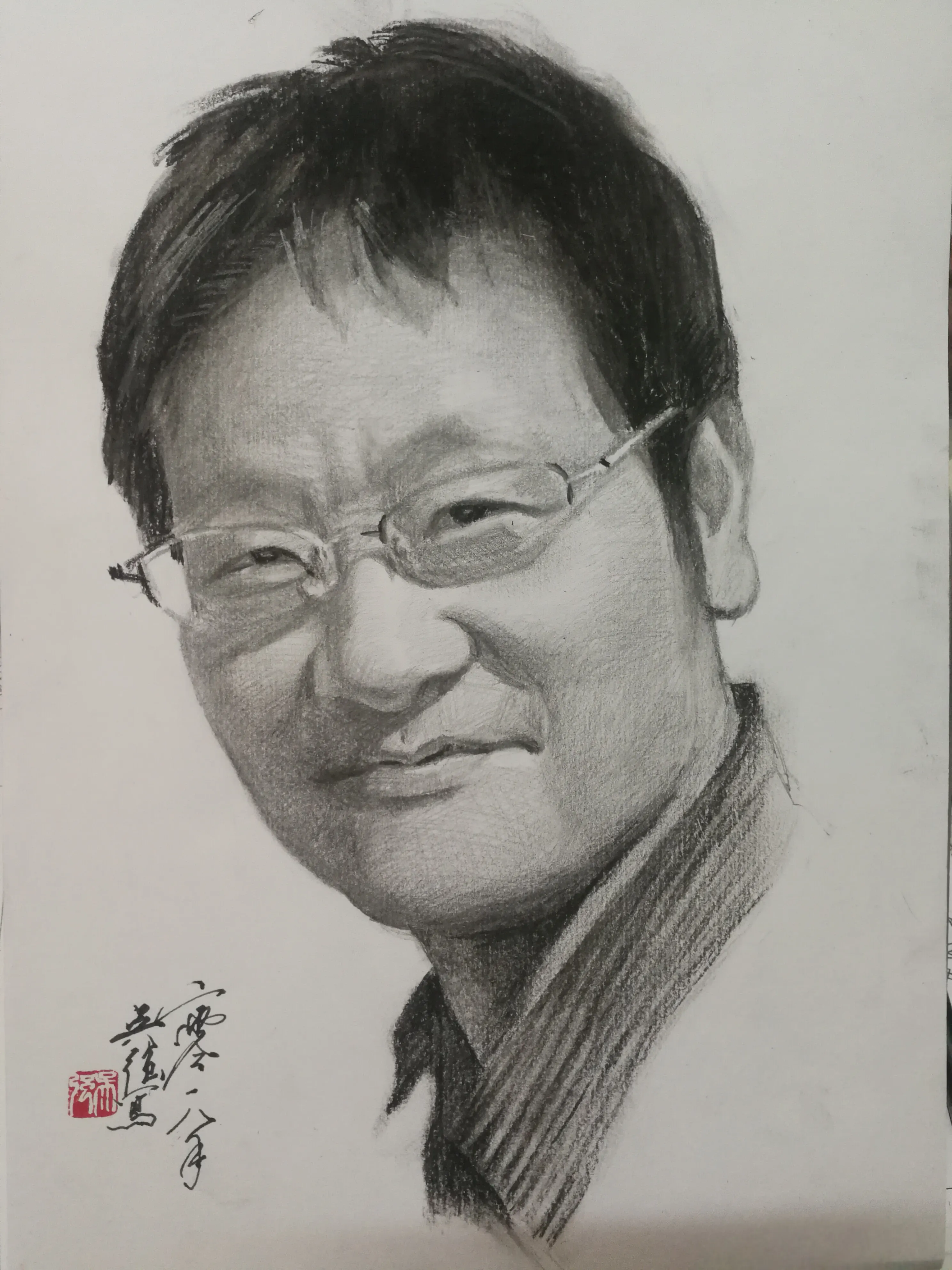 吴强绘制的素描人物肖像2018年12月17日,经过一个星期的低温阴雨,南昌的天气终于晴朗了起来,中午时分已是艳阳高照,久违的太阳让人的心情舒展开来,那冬日的阳光照晒得直让人心里暖暖的。今天的心情特别特别的好,也特别特别的开心,一方面在外求学的儿子下午要回来,我请了假准备去机场接他;另一方面临近吃午饭的时候,接到来自厦门的翰墨金石家吴强先生,参照我给他的那组精彩照片为我绘制的人物肖像画。展开吴强先生所绘肖像,应该说画的非常棒!构图精准,布局合理,线条流畅,神态自然,把人的精气神刻画的淋漓尽致。让一个充满自信,活力四射,活泼开朗,具有书香气息的人物展现在大家面前。那微笑自若,淡定似水的神情,仿佛使画上之人物随时在与观者对话,眼睛专注的与你对视。整个画面洁净,画工细腻,画毕画家还在画面的左下方留白处,分两行以行草落款题名:二零一八年,吴强写。同时与两行题款并排钤盖上画家自己刻制的白文印吴强,犹如画龙点晴,使整幅肖像画面更加完美。
