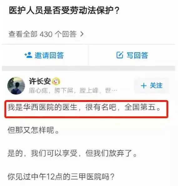 但在知乎上却称自己是“华西医院医生”:
