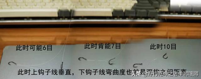 我们野钓时精准找底就是,看双钩刚刚到底,且上钩子线垂直的时候,也就是上图最右边的那种状态。