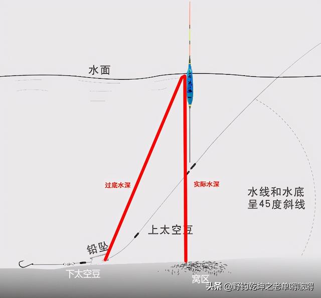 挂重铅,抛竿然后浮漂露出1目,将太空豆捋至浮漂出,做个参考。注意:抛满竿,水线倾斜,会出现过底的现象:如下图: