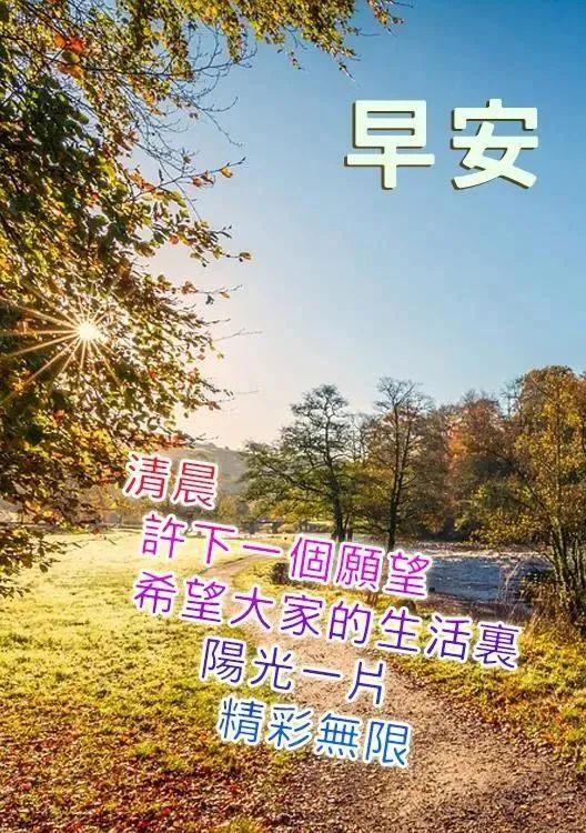 用清晨的阳光沐浴,给你舒展;用清新的空气洗漱,给你舒心;伴清莹的雨露散步,给你舒情;向美好的一天欢呼,给你舒怀,用快乐的词汇凝聚,给你祝福,祝你在绚丽的晨光中走好每一天。早安!