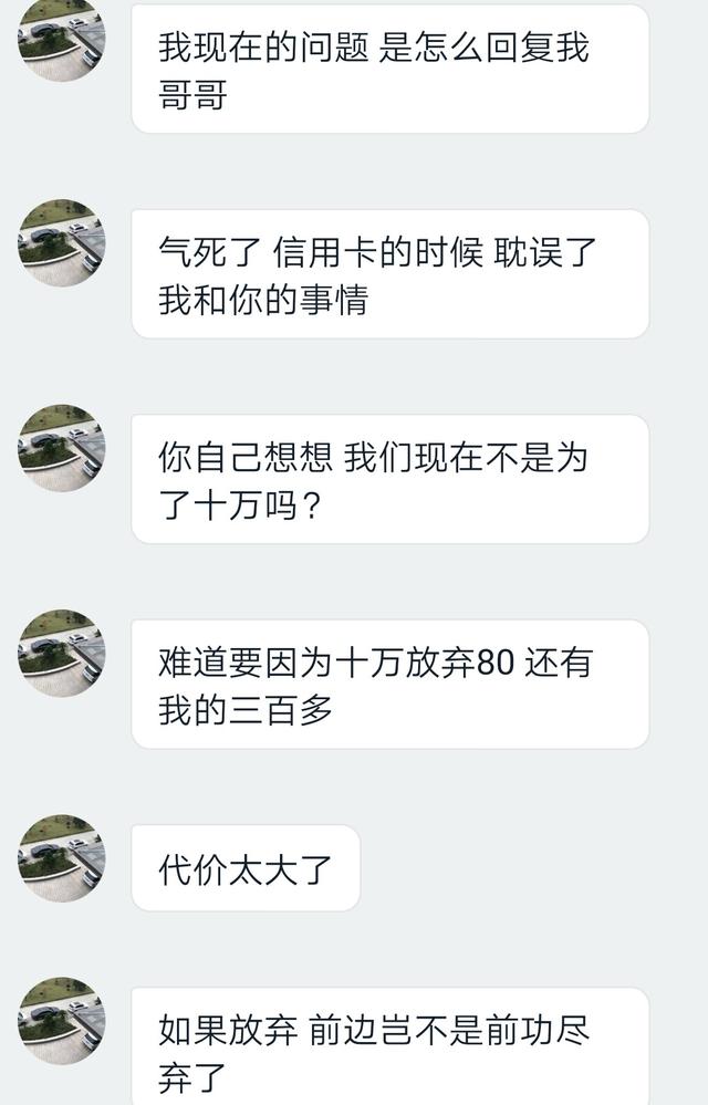 于是他让我想办法再去借钱,我害怕,不敢告诉人家,我担心人家会说我被骗了,我是这么相信这个男朋友,我不相信他会骗我,我真的喜欢他,对他动了情,就是没好好用脑考虑问题,我也不知道哪里去借的钱,网贷,信用卡,问朋友,问弟弟借,凑满了十万,现在里面有了二十万了,他也说他好不容易凑满了80万。