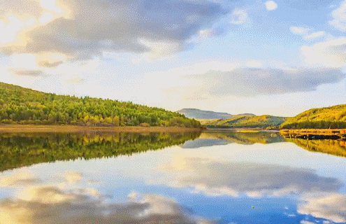 碧蓝的池水里倒影着四周山坡上的翠绿的雪松,