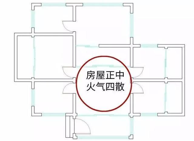 虽然住宅中宫的五行属土,但坐落于房屋中央的厨房火气容易四散,缺乏安定祥和,对家人的健康和财运极其不利。