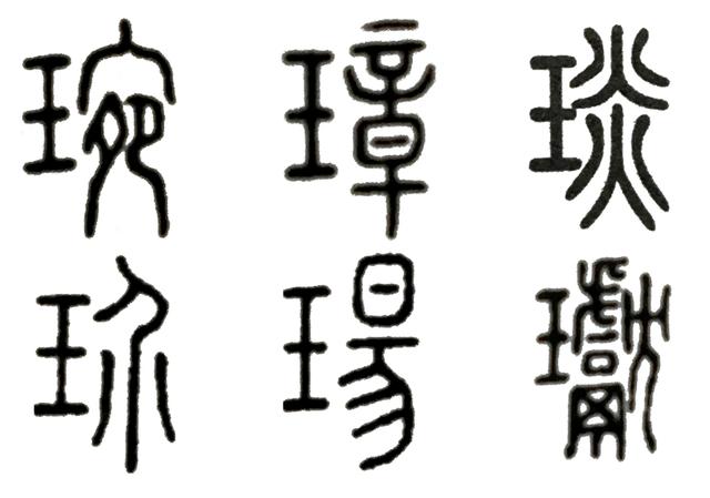 2、璋。读作zhāng。《说文解字》释作:“剡上爲圭,半圭爲璋。”圭的一半长短叫“璋”,圭的上半部截去叫做“璋”,“璋”的长短大小也跟使用的场合不同而改变。《考工记.玉人》中记载:“大璋、中璋九寸,边璋七寸,射四寸,厚寸……”那为什么字上配了一个“章”呢?来看“章”的意思,章的意思是:“乐竟谓一章”,从音从十,音是音乐的意思,十是数字的终了,就是音乐终了就算一“章”,或者说是一段音乐叫一章,因此,“璋”就是截断了的圭叫做“璋”,或者是一段圭叫做“璋”。关于“璋”,《诗经》中还有一个重要的意项,后来还经常用,就是“弄璋”。