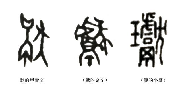 《说文》解说:“宗廟犬名羹獻。犬肥者以獻之。”按通俗的理解就是宗庙里的狗,其中肥的宰杀后做成肉汤叫“獻”,看甲骨文字形就是一个“鬳”,加一个“犬”,所谓的“鬳”就是一种煮食用的器具,在里面煮狗肉叫“獻”,“獻”的本义就是狗肉做成的肉汤。“肥狗”跟“公”的地位有类比,所以可以简单的记下来:只有公才能执的圭,叫“瓛”。形状跟圭一样,长度为9寸。