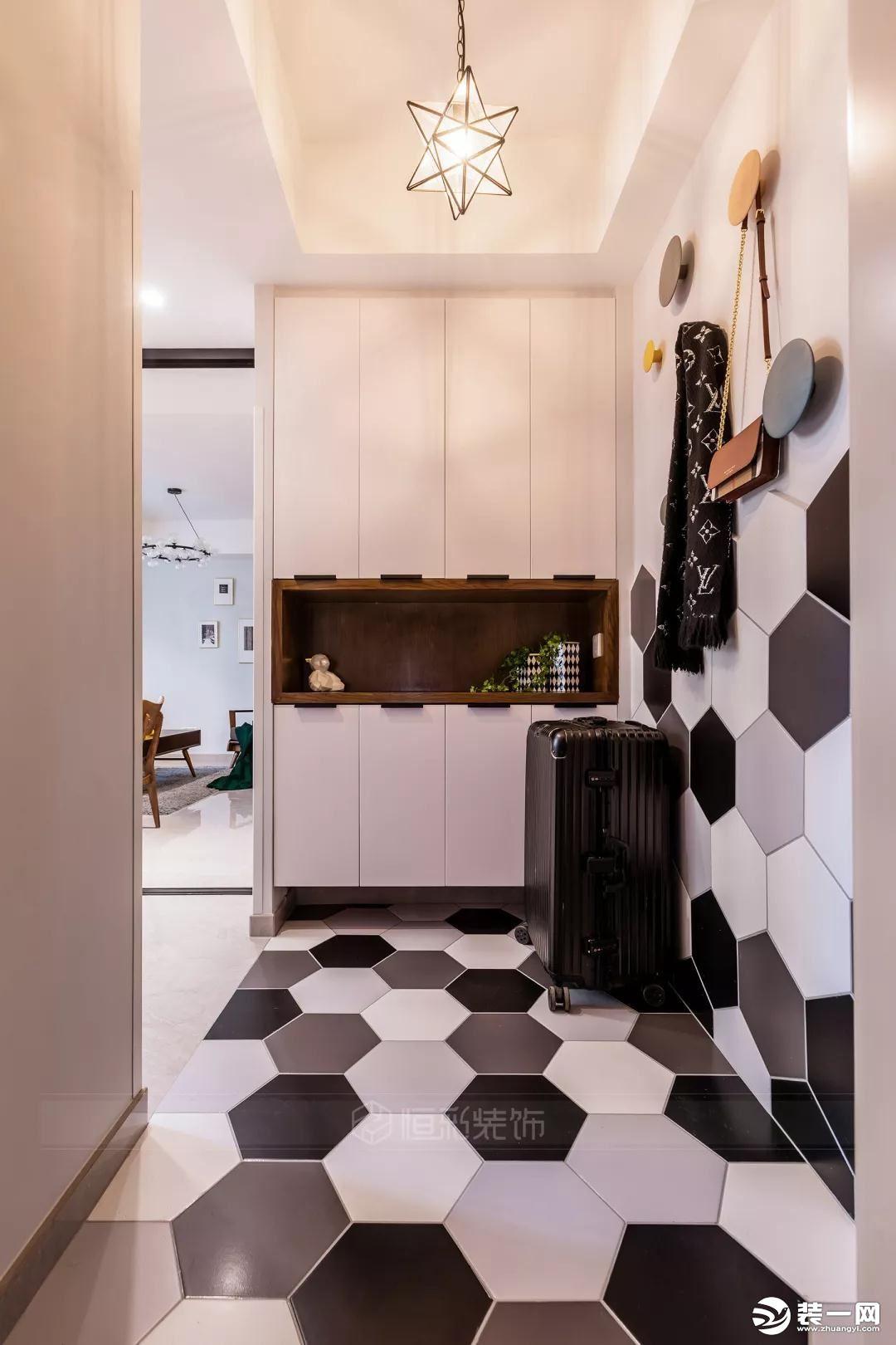 如果单独放一个鞋柜觉得过于单调,可以在鞋柜后面做一层薄薄的镂空隔断,这样看上去会协调很多。