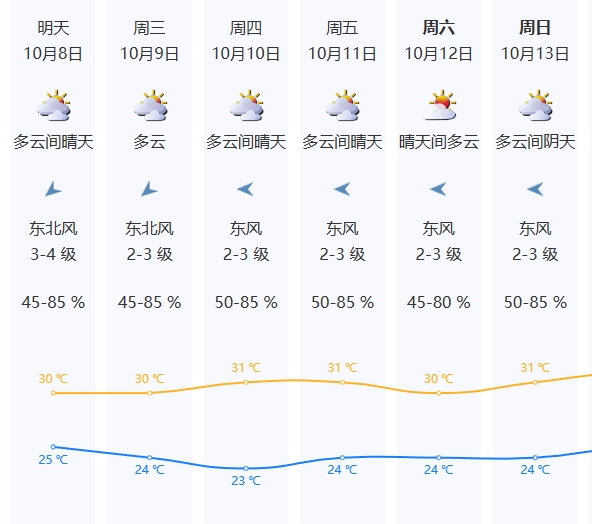 ● 8-9日受弱冷空气影响,多云间晴天,沿海、高地和海区最大阵风7级左右,8日气温25-30℃。