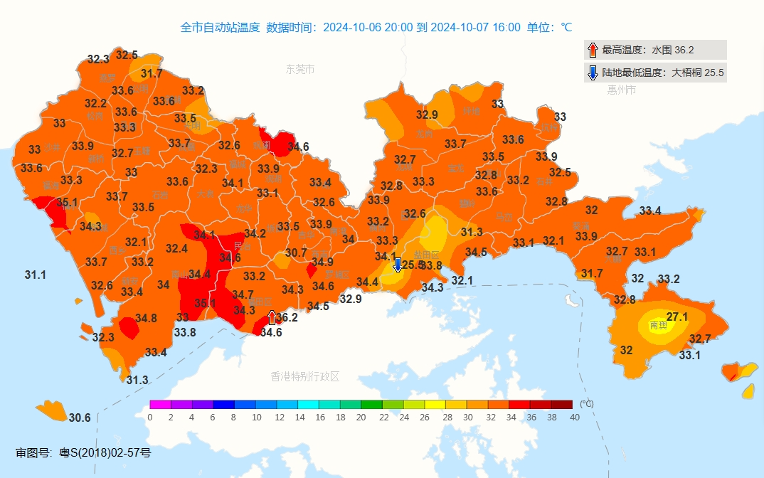 据深圳市气象局监测,截至今天(7日)16时,全市最高气温36.2℃(福田区福田街道水围站);全市所有气温站点中已有124个站出现33℃以上,有3个站出现35℃以上。