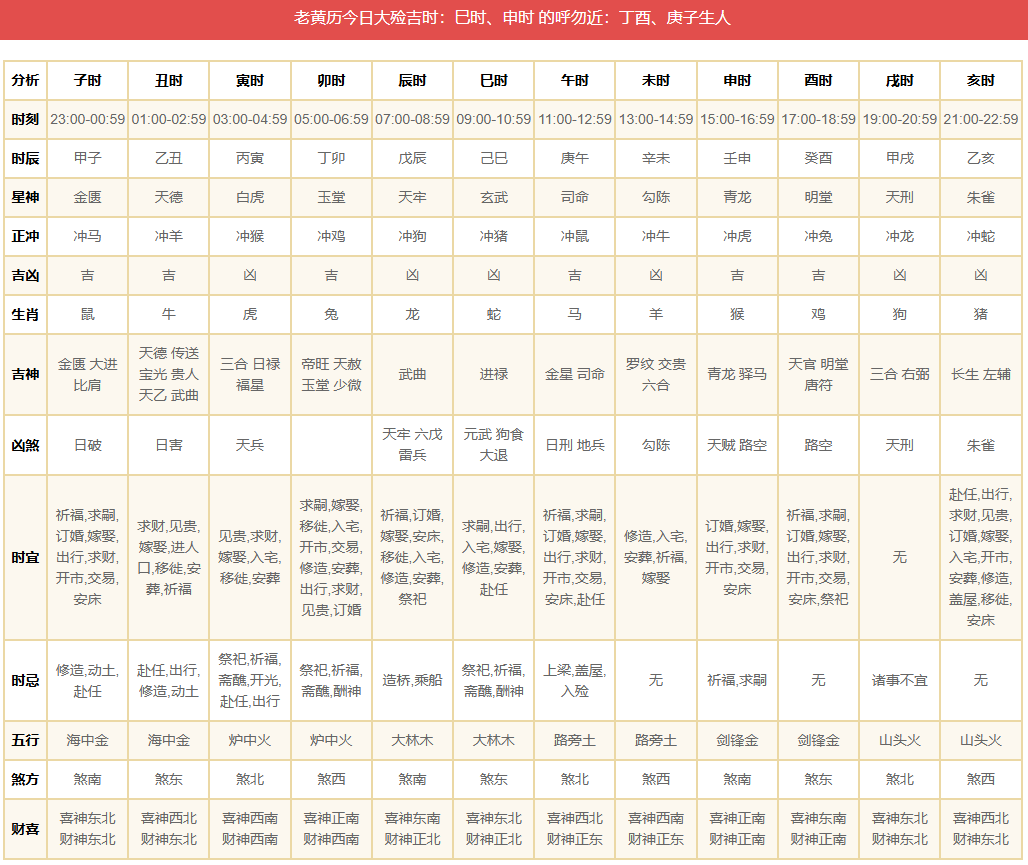 时宜:祈福、订婚、嫁娶、安床、移徙、入宅、修造、安葬、祭祀(但非大殓吉时)