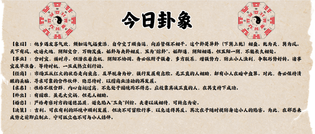 【象曰】:他乡遇友喜气欢,须知运气福重添,自今交了顺当运,向后管保不相干。姤卦,异卦相叠,乾为天,巽为风,天下有风,吹遍大地,阴阳交合,万物茂盛。此卦象寓意着在合适的时机,顺应时序,但需注意阴阳不协调的潜在危机。