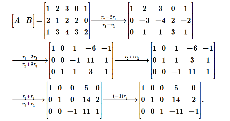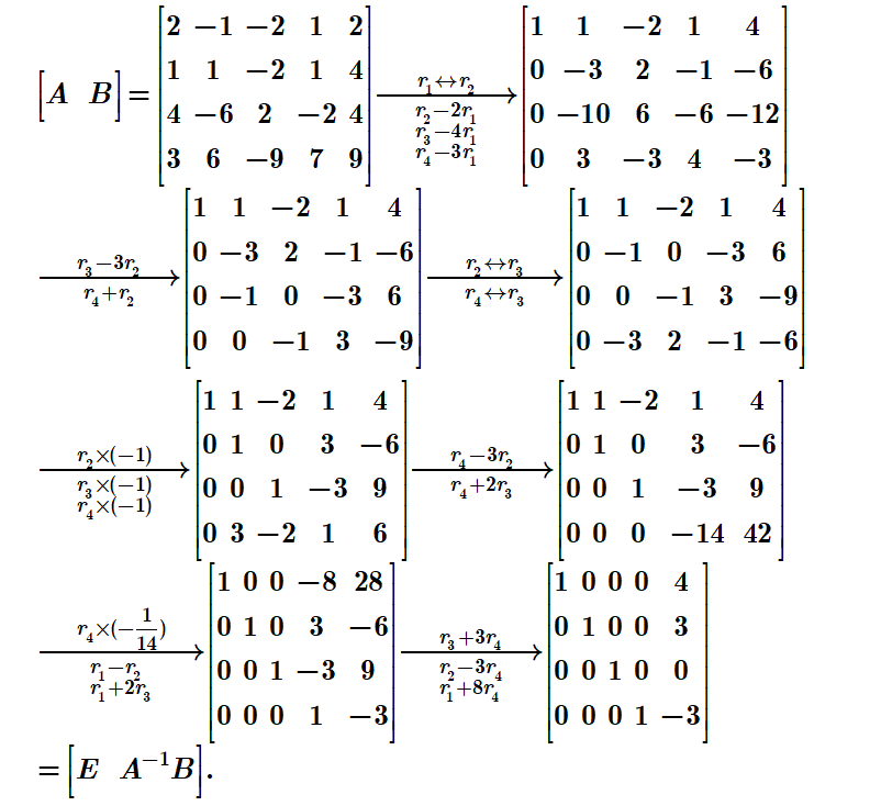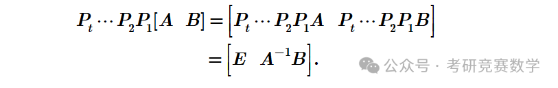 故方程组 有唯一解且 可逆. 在 两端左乘 ,得 ,则可以直接利用初等变化法求得 ,具体过程与直接求 方法一致,只不过右侧矩阵为 ,即