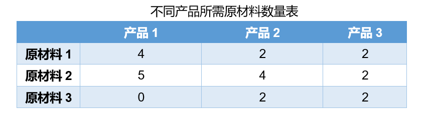 某工厂生产三种产品,一个月可用于三种产品的三种原材料分别为 300 个单位, 420 个单位和 260 个单位. 该厂要为每月用完这些材料指定生产计划表,不同产品所需的原材料单位数量如下表: