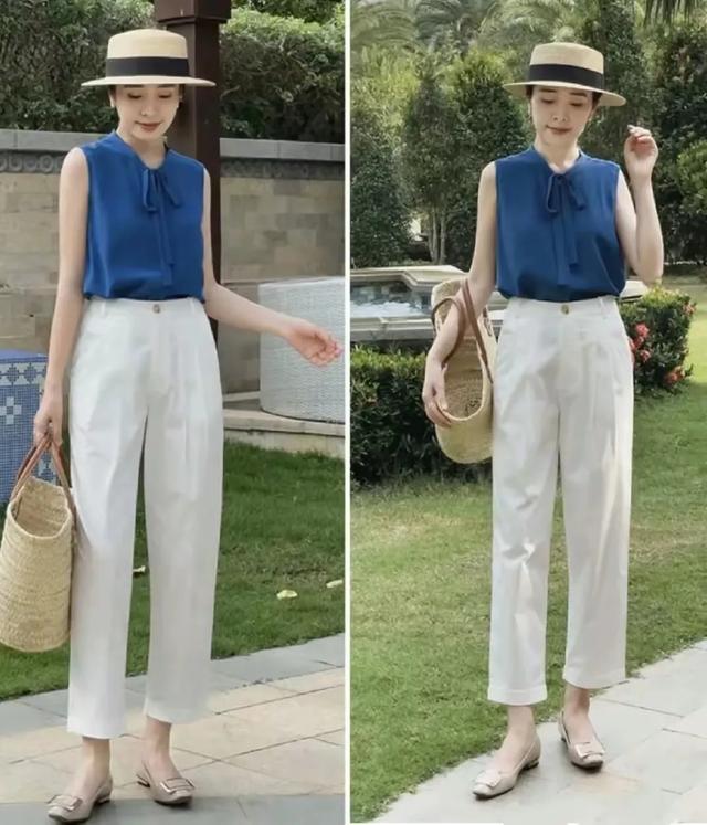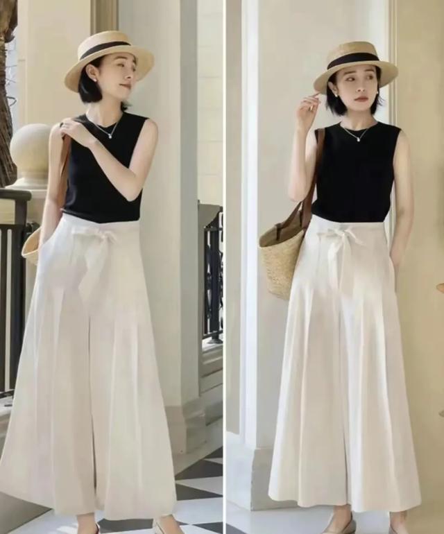 ②,黑色的无袖上衣搭配上白色的阔腿裤