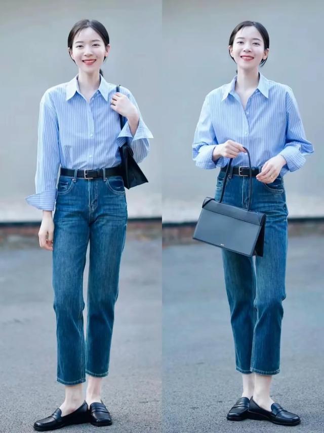 第三套是选择了条纹的针织衫,搭配上直筒的牛仔裤,脚踩的一双黑色的单鞋,这样的创意造型,通勤又时髦,非常适合职场女性穿搭。