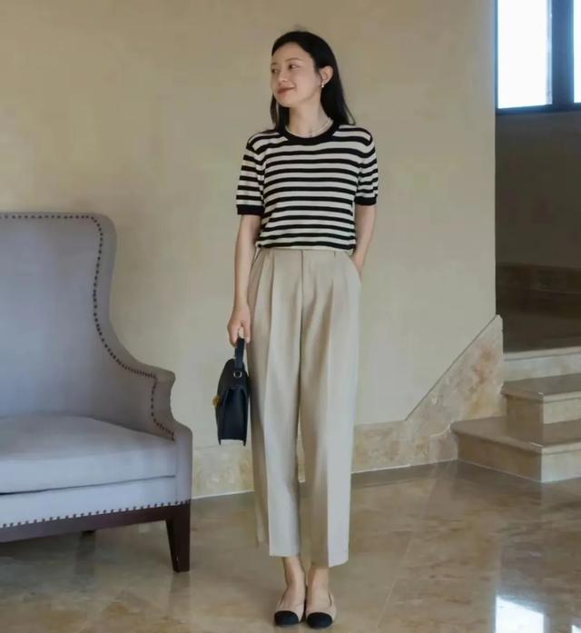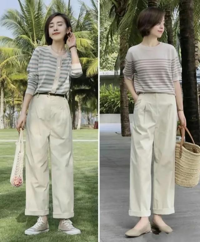 如果想要自己的穿衣打扮更加的柔和,其实还是很推荐大家选择杏色的衣服款式的杏色更修饰肤色,显白显嫩,和白色色彩相近。例如,这位素人博主就选择了条纹的针织上衣,搭配了杏色的直筒西裤,脚上分别踩着一双帆布鞋和浅口的单鞋。帆布鞋搭配杏色的西裤会更休闲,浅口单鞋的搭配提升整个人的品质,更优雅,更大气,有着很大的区别。