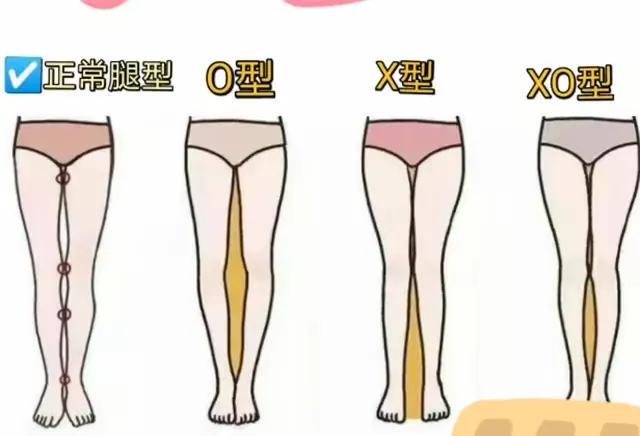 每个人的腿型是不同的,大家看下面这张图片就知道了,有O型腿,X型腿,xo型腿,再和正常的腿型进行对比就有答案。