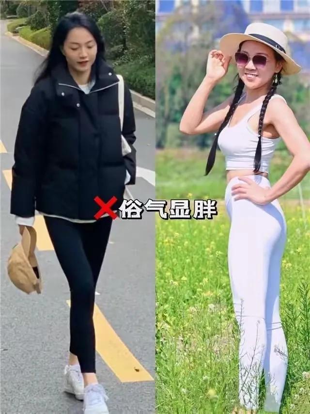 如果有腿粗胯宽等问题,还像下面这两位数的模组一样,穿的紧身裤,瑜伽裤,鲨鱼裤会暴露缺点,无疑显得俗气,廉价不好看。