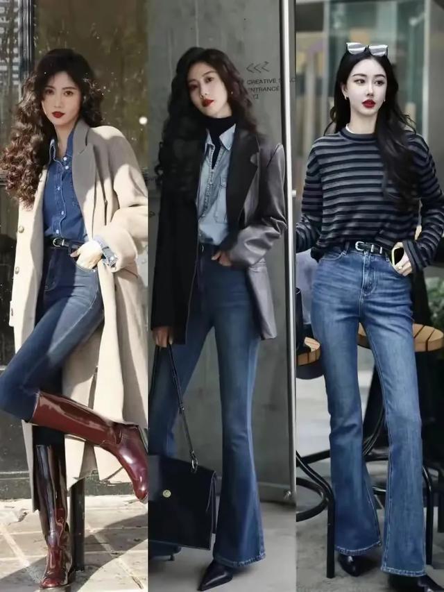 当然你也可以走酷炫一点的造型,例如中间的这一套,用皮质的西服外套内搭蓝色牛仔衬衫,叠穿一件针织衫,这样的叠加穿衣造型更有层次感,下半身选择了一款牛仔喇叭裤,脚上踩着一双尖头低跟鞋,这样的打扮很有港风的气质。