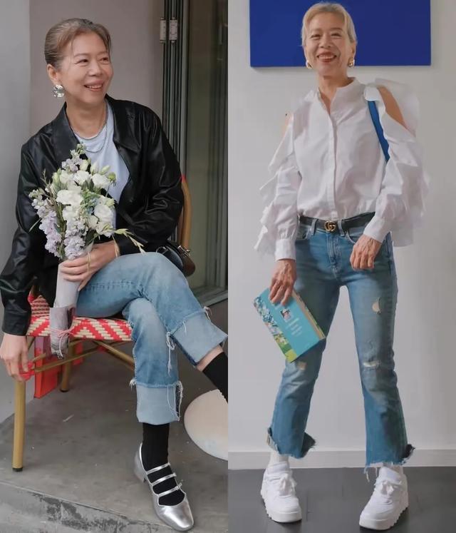 例如下面这位素人博主穿的白色衬衫,搭配的牛仔九分裤,牛仔裤是属于紧身款,穿在身上之后显得腿短,而且还是破洞的牛仔裤,根本不符合中年女性,有装嫩的嫌疑。