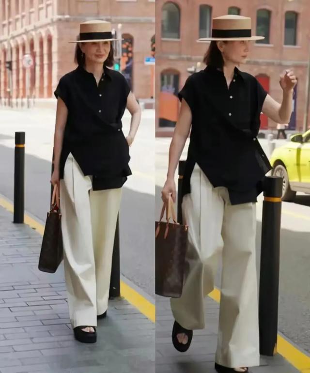 如果你是五六十岁的中年女性,也可以向下面这位素人一样选择的是黑色的宽松版衬衫,搭配上杏色的直筒西裤,脚上选择的是黑色的厚底凉鞋,再用一款草帽来点缀,氛围感直接拉满,简约又大气。