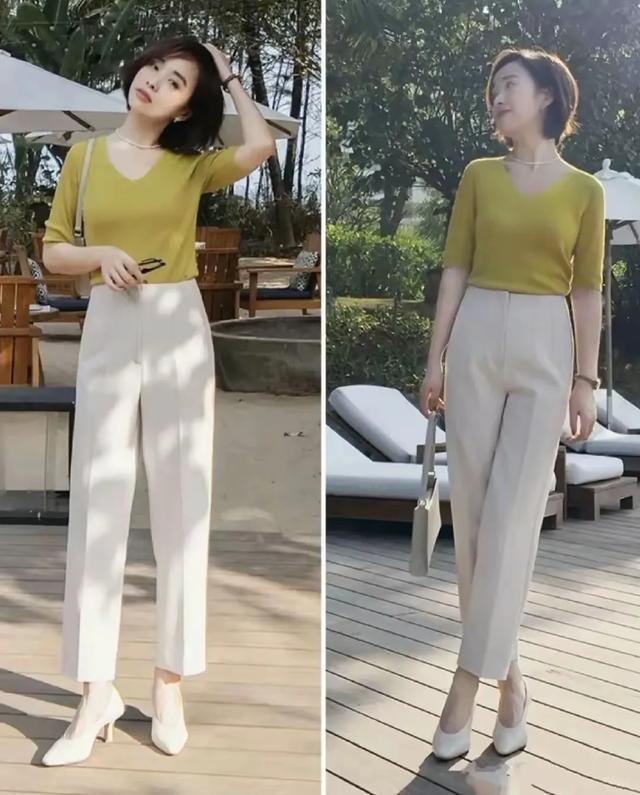 如果你觉得阔腿裤穿起来过于膨胀,我们可以换成九分西裤,不仅能巧妙地遮住了腿部的小瑕疵,还能营造出一种慵懒随性的气质,例如下面这位博主用黄色的针织短袖上衣搭配上杏色的九分西裤,脚上踩着一双浅口的单鞋,再用一款腋下包来点缀,脖子戴的一款珍珠项链,精致优雅又大方,而且这位素人博主还是属于小个子女生,完全看不出他是一米六以下的女性。