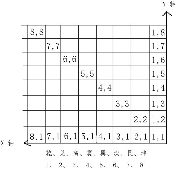 这里借用数学上的一些概念,水平方向的假设为x轴,垂直方向的假定为y轴,以方图的右下角的乾卦(1,1)作为起始点,这个起始点类似于平面直接坐标系的原点一样。在乾卦(1,1)中,第一个"1"代表外卦的乾,第二个"1”代表内卦的乾。注意把握三个方向,水平方向,斜对角线,垂直方向。水平方向上,内卦都是数字1。外卦的数字从1到8逐渐变化;在垂直方向上,外卦的数字都是1,内卦的数字从1到8逐渐变化。