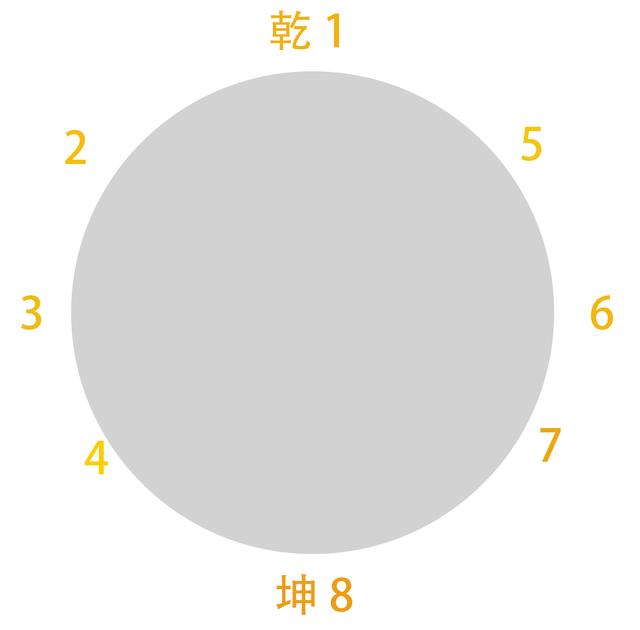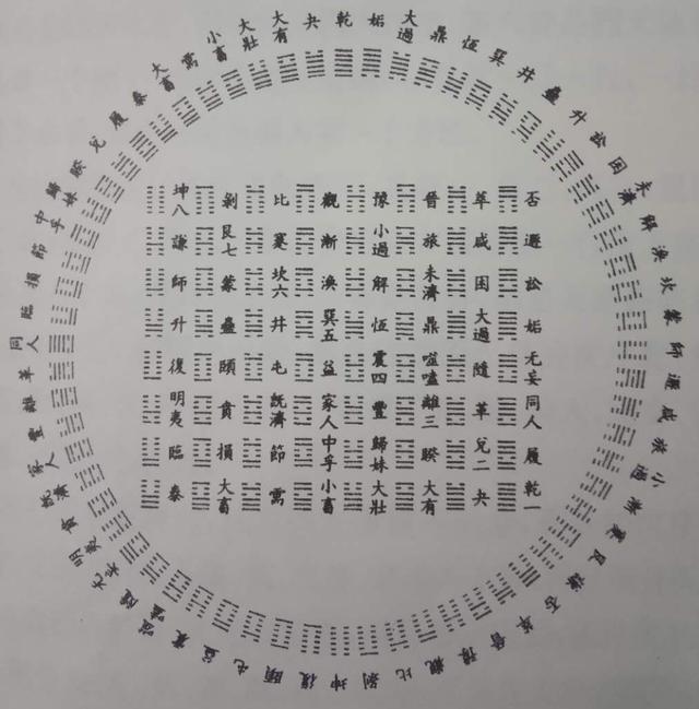 先从1—2—3—4的方向,再到5—6—7—8的方向,所谓的"天道左旋","地道右旋"。上述圆图的六十四卦的排列大体也是按照这个顺序把相应的卦"放"上去的。在左旋方向上把方图的第1、第2、第3、第4行的卦依次放到了圆图的左半圆上,在"右旋方向"上再把方图的第5、第6、第7、第8行的卦依此放到圆图的右半圆上。最终形成了方圆图。知道了方图的排列,圆图也差不多记住了吧。